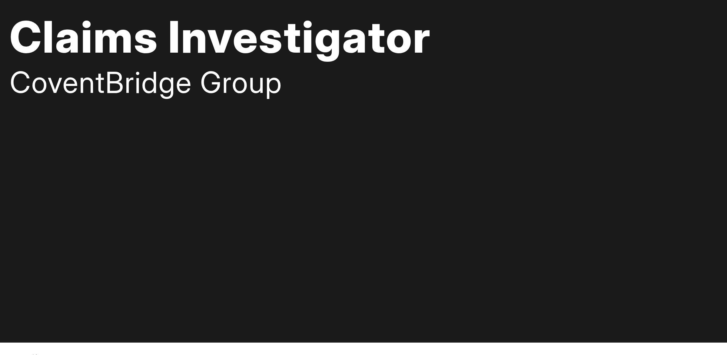 Immediate need for a Claims Investigator within the largest worldwide investigative solutions company. Join CoventBridge Group as it continues its expansion into all areas of investigations, allowing continual growth for its employees.