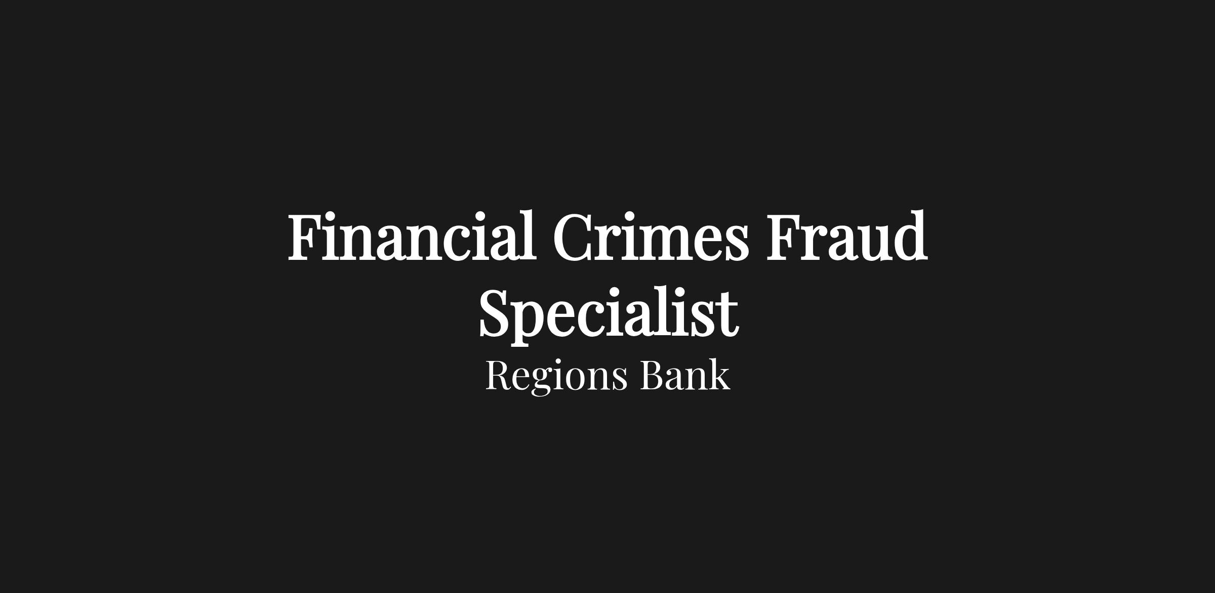 At Regions, the Financial Crimes Fraud Specialist monitors fraud prevention reports and/or reviews and resolves claims to address potentially fraudulent activity and reduce possible losses.