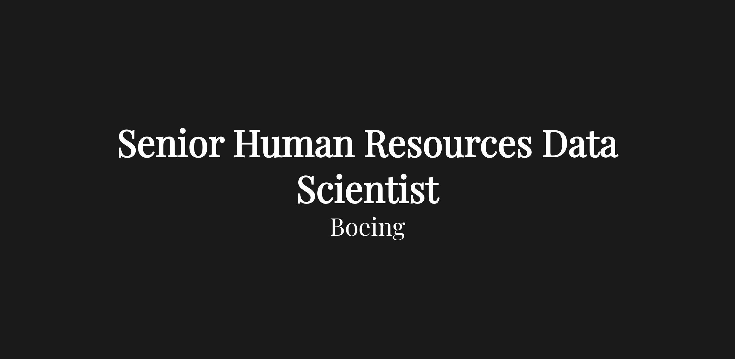 The Boeing CompanyThe Boeing Company’s Talent Analytics and Innovations team is currently seeking a Senior Human Resources (HR) Data Scientist to join our team in Seattle, WA, Arlington, VA, North Charleston, SC or Berkeley, MO.