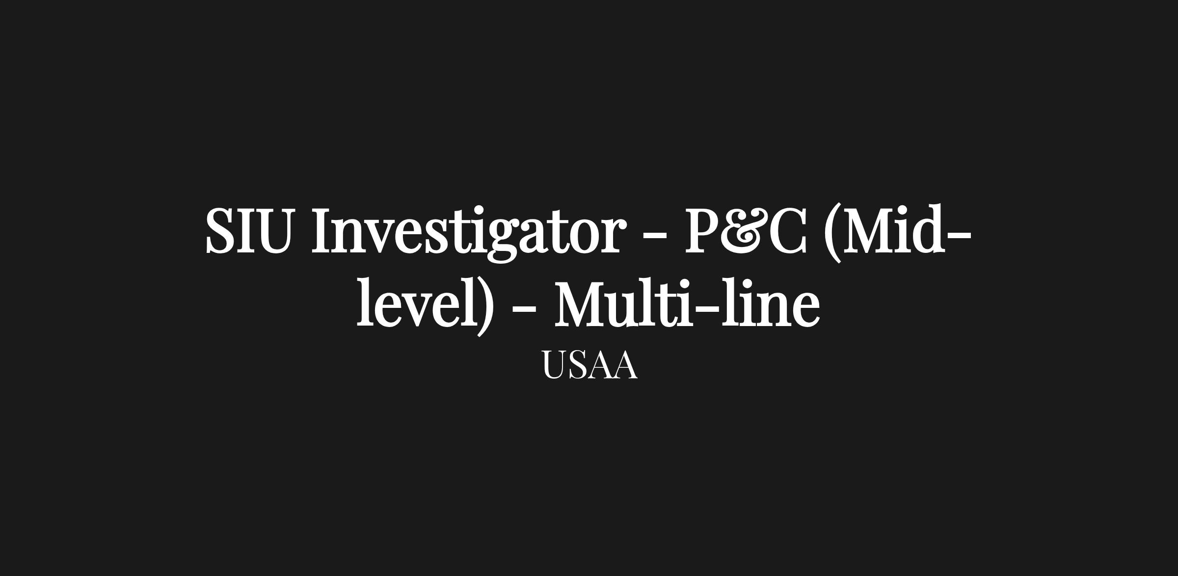 We are looking for a SIU Investigator (mid-level). This is a desk position. Within defined guidelines and framework, protects USAA and our members from potential fraudulent claims by investigating questionable, suspect claims activity in compliance with state insurance fraud-related laws and regulations and policies and procedures. The candidate selected will have strong multi-line SIU Investigation experience.