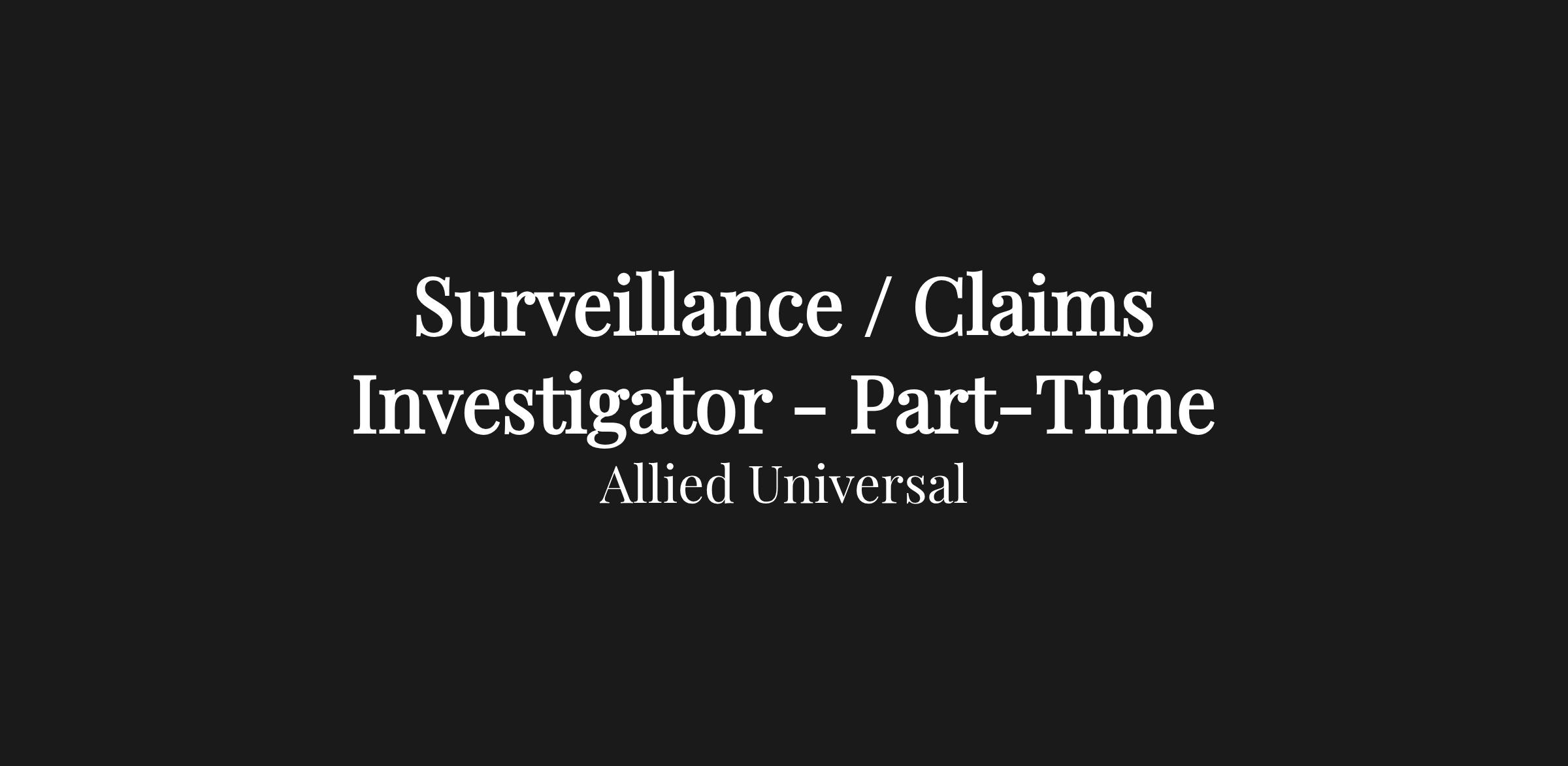 Allied Universal® is hiring a Surveillance / Claims Investigator. Surveillance / Claims Investigators validate the facts of loss for Insurance claims through scene Investigations, claimant and witness Interviews, document retrieval and data Interpretation.