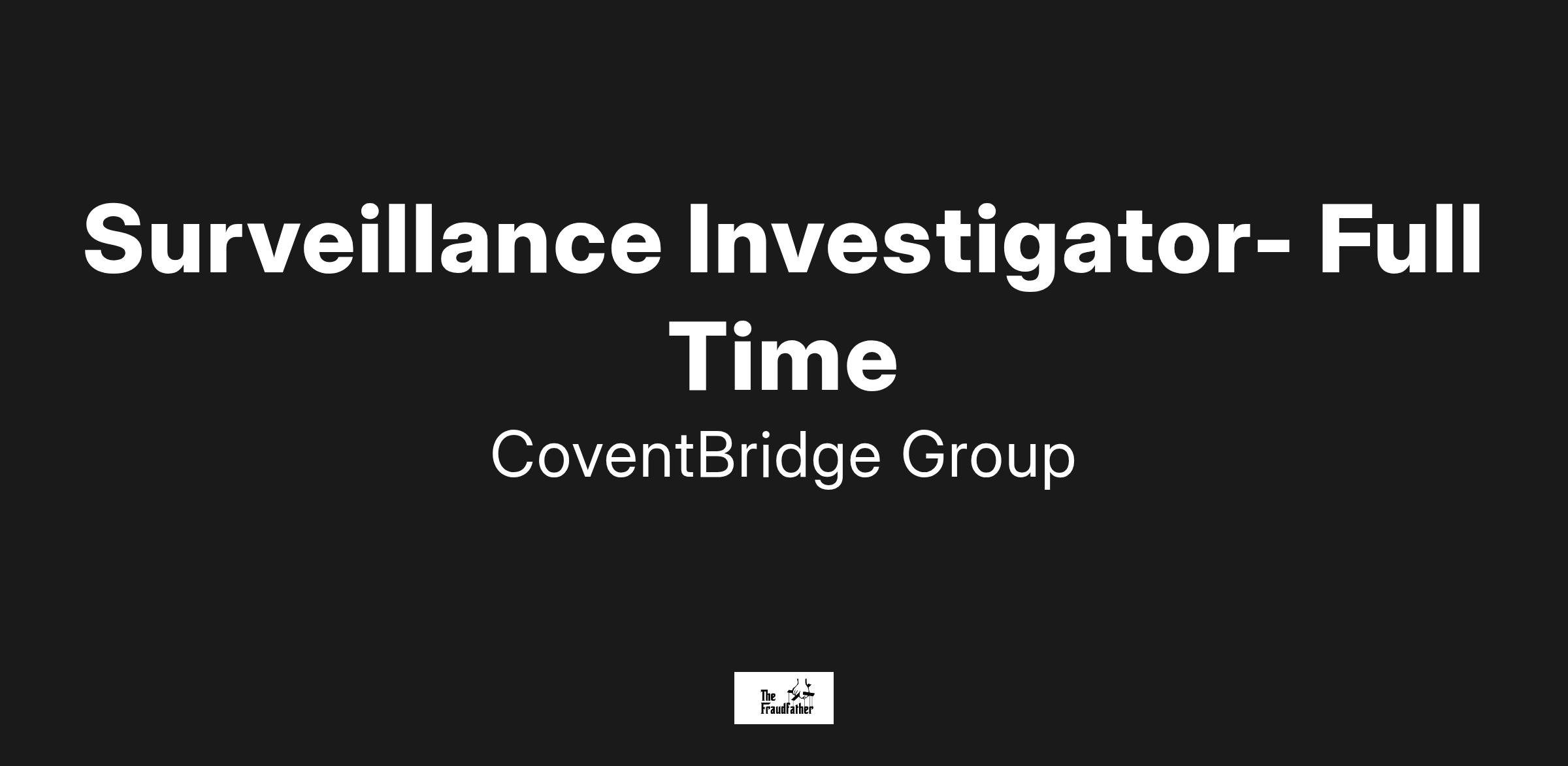 Immediate need for a Surveillance Investigator within the largest worldwide investigative solutions company. Join CoventBridge Group as it continues its expansion into all areas of investigations, allowing continual growth for its employees.