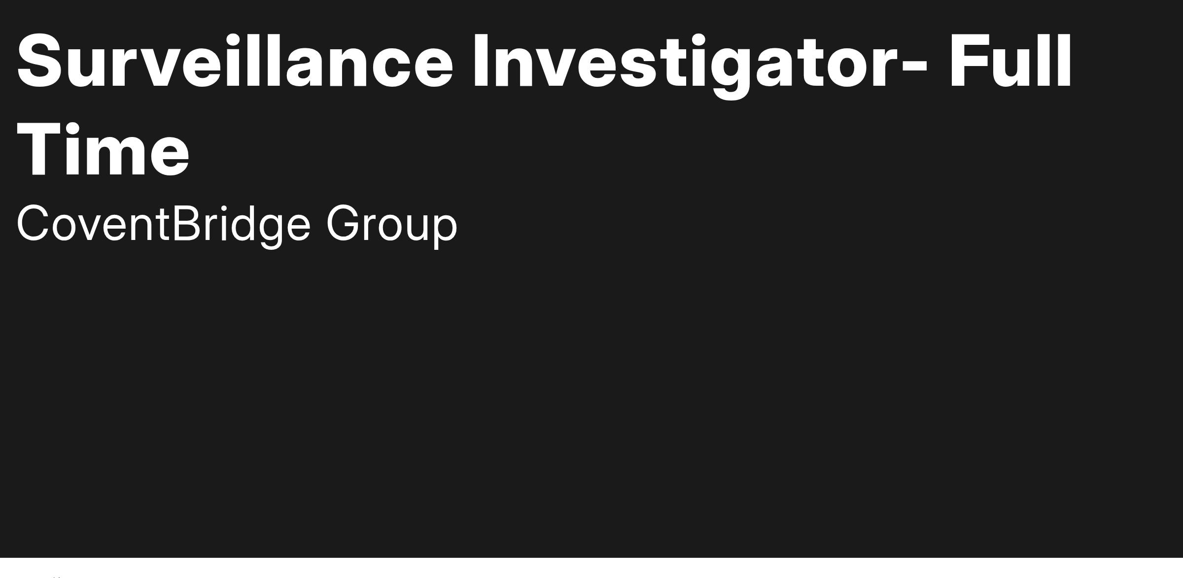 Immediate need for a Surveillance Investigator within the largest worldwide investigative solutions company. Join CoventBridge Group as it continues its expansion into all areas of investigations, allowing continual growth for its employees.