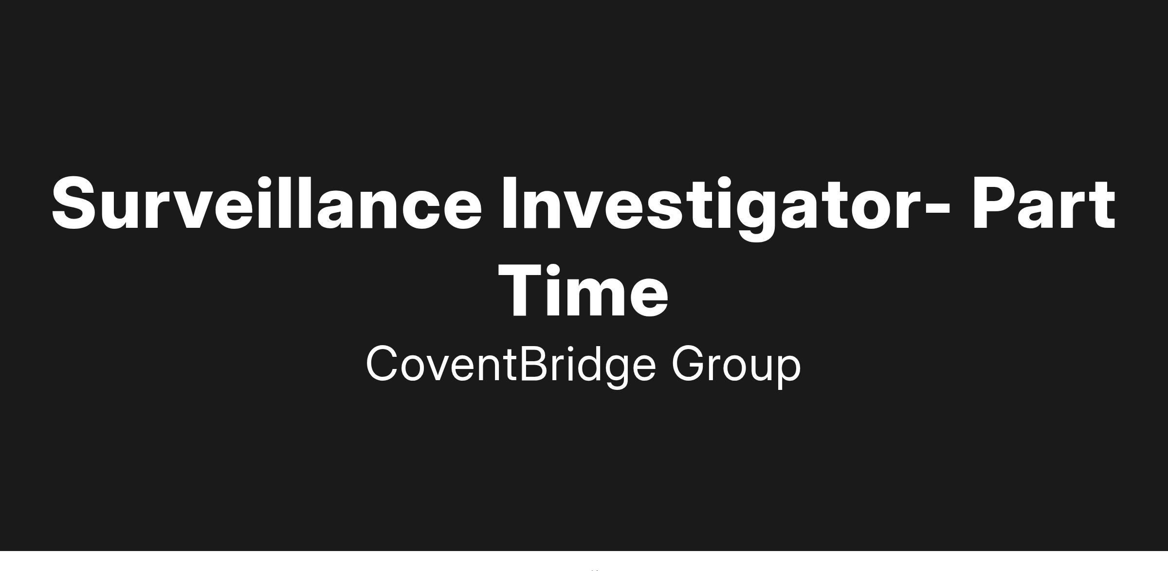 Immediate need for a PT Surveillance Investigator within the largest worldwide investigator solutions company. Join CoventBridge Group as it continues its expansion into all areas of investigations, allowing continual growth for its employees.